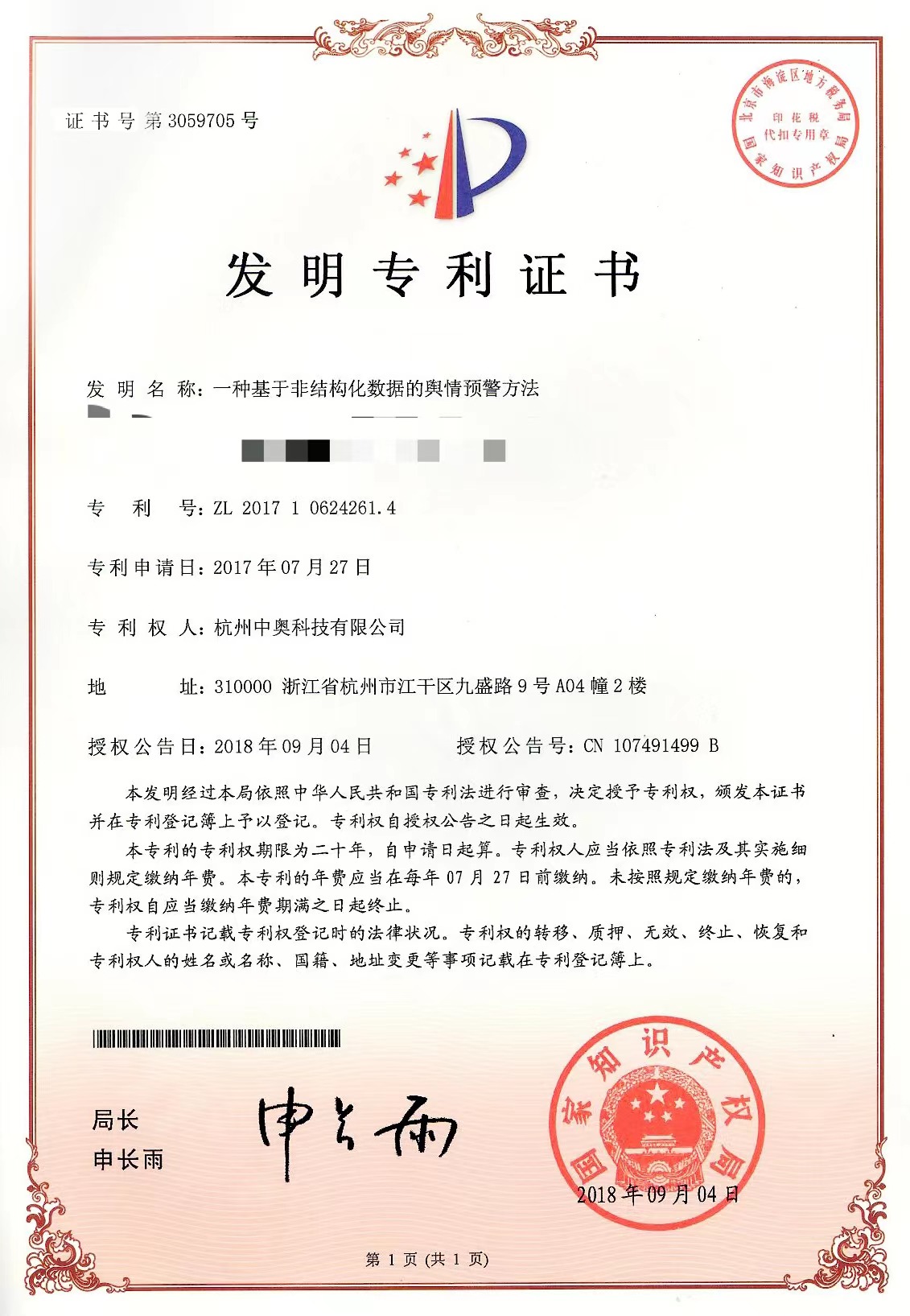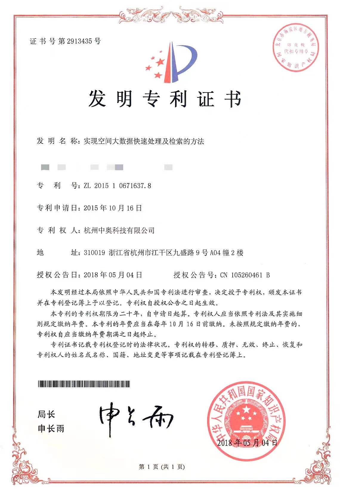 中奧科技在大數據領域獲得了中奧數據中臺軟件V1.0、實現空間大數據快速處理及檢索的方法、中奧數據中心一體化管控系統管理軟件V1.0 、中奧空間數據可視化共享服務軟件V1.0 、中奧數據中臺軟件V1.0等軟件著作權。