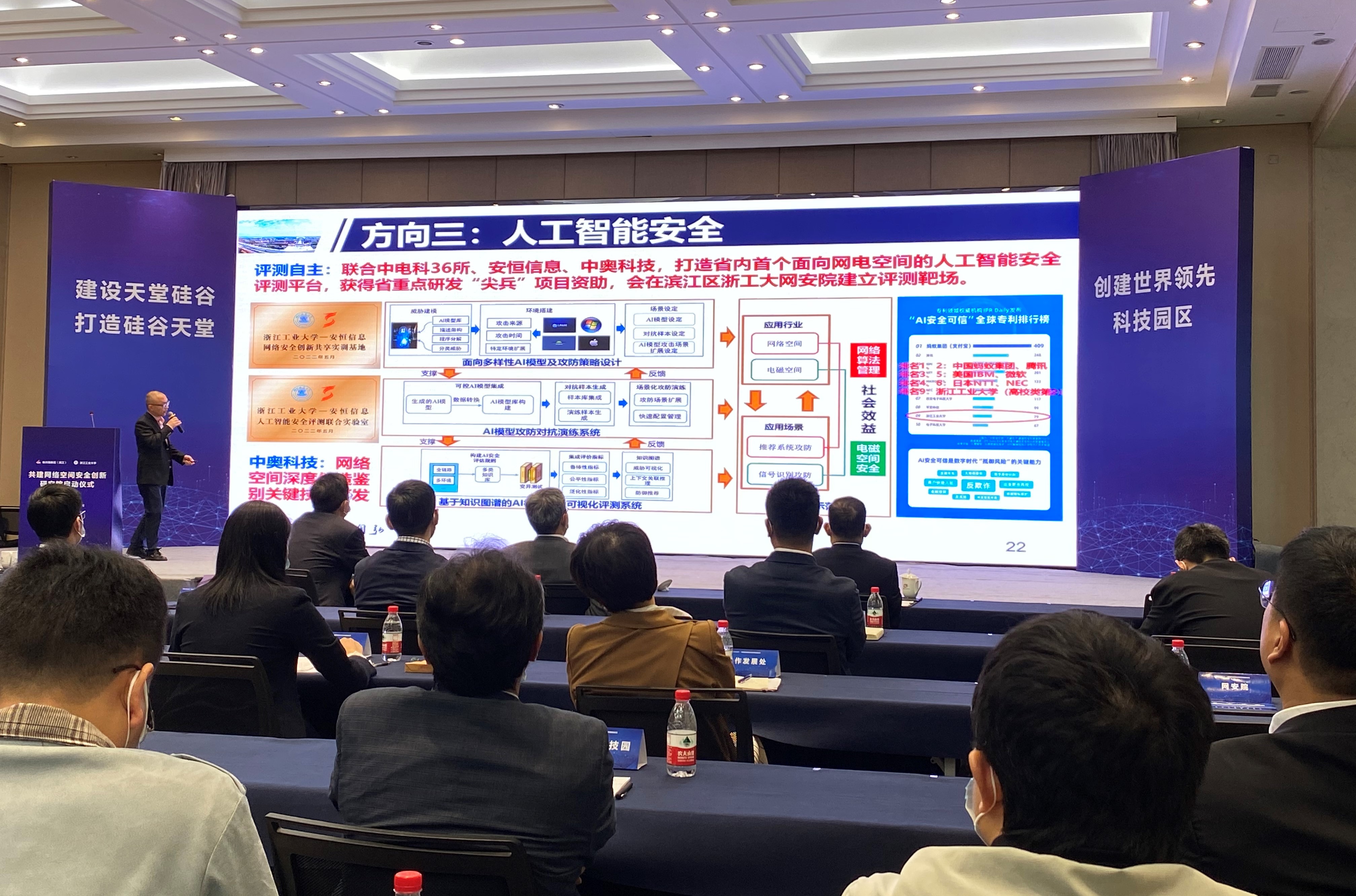 中奧科技副總裁張亮與濱江區(qū)浙工大網(wǎng)安院院長宣琦就“人工智能網(wǎng)絡(luò)安全·深度偽造鑒別技術(shù)研發(fā)聯(lián)合技術(shù)攻關(guān)"進(jìn)行簽約。