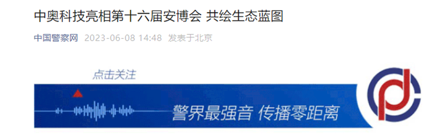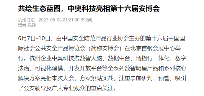 2023年6月7日-10日,為期4天的2023第十六屆(2023)中國國際社會公共安全產品博覽會(以下簡稱安博會)在北京首鋼會展中心圓滿落幕。杭州中奧科技有限公司(簡稱“中奧科技”)“重拳”出擊,以“ 凝聚生態伙伴 共創數智融合生態新格局 ”為主題,盛裝亮相2023安博會,得到了眾多合作伙伴、相關企業的熱情關注,同時受邀央視10科教頻道專題采訪,中國警察網、浙江日報、杭州日報、新浪等多家媒體相繼報道。在此向大家表示誠摯的謝意,感謝一同見證,參與此次展會。